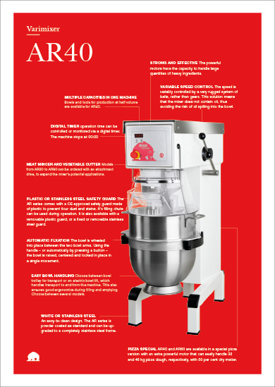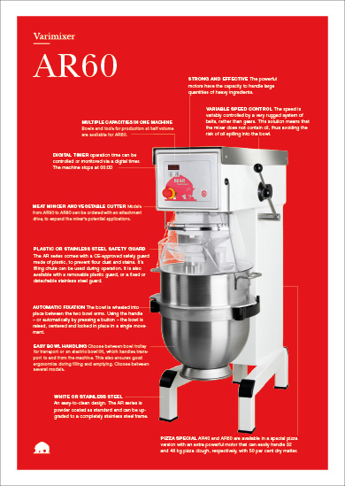 The legendary Varimixer AR series meets the requirements for rugged, powerful 30, 40, 60, 80 and 100-litre mixers. It boasts infinitely variable speed and a unique ergonomic and time-saving mechanism that lowers, raises and locks the bowl in place in an automatic movement, making operation of even the largest machines quite simple. There are many options for customisation to special requirements. Whether you need to beat, whip or knead, there is likely to be a Varimixer AR that is perfect for the job. For medium-sized bakeries or commercial kitchens, or large-scale food production. The speed is variably controlled by a very rugged system of belts, rather than gears. This solution means that the mixer does not contain oil, thus avoiding the risk of oil spilling into the bowl. Simply place the bowl between the two arms, and it can be lowered, raised and locked in place in a single smooth movement. No heavy manual lifting. Varimixer AR 30-80-litre models come with either manual speed control and bowl raising and lowering using a lever, or automatic control using the machine’s intuitive display. In the 100-litre Varimixer AR these functions are automatic. The AR series comes as standard with fixed safety guards made of CE marked and EU-approved plastic, with a chute that allows ingredients to be added during operation. But the machine is also available with a detachable plastic guard, or a fixed or detachable stainless steel guard.